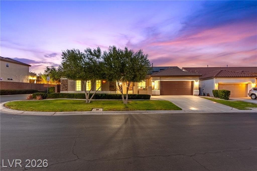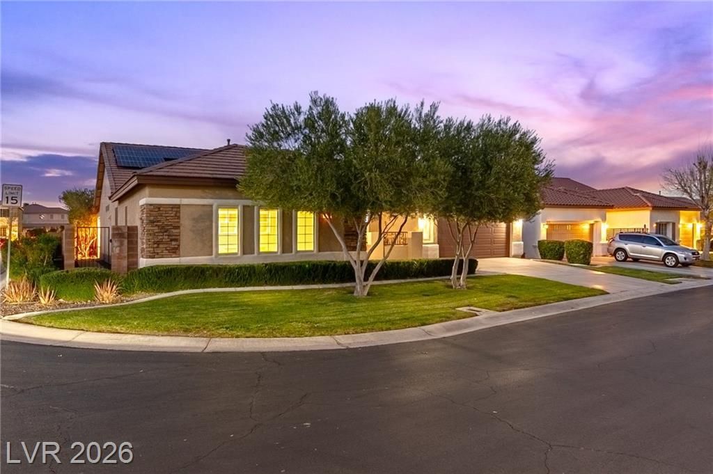 Experience resort-style living in this stunning single-story turnkey home in the gated Southern Terrace community. Perfectly positioned on a corner lot just walking distance to Bishop Gorman High School, you'll enjoy the perks of bordering Summerlin without the added fees. This 4-bedroom, 3-bath residence features a 3-car garage, a double-door den, and a dramatic round foyer entry. The open-concept floor plan is packed with upgrades, including high ceilings, new paint, tile flooring, and a chef's kitchen with granite countertops and double ovens. Energy efficiency is built-in with Low-E windows, superior insulation, and Sun Run Solar. Outside, your private oasis awaits with mountain views, a putting green, and a lush orchard featuring pear, plum, lemon, persimmon, fig, orange, and peach trees. Located near The Curve with instant 215 access, you are minutes from elite shopping and dining. Community amenities include a fitness center, pools, spa, and trails.