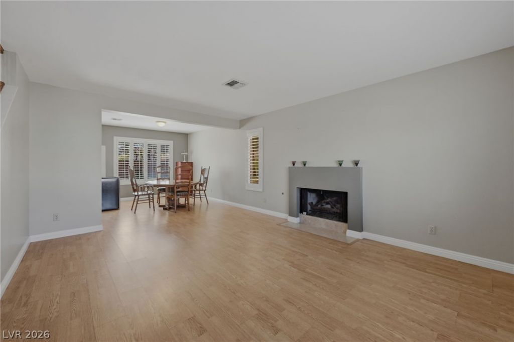 Beautiful two-story home in the highly desirable Lakes master-planned community, ideally located on a quiet cul-de-sac. Charming curb appeal. 3 beds, 2.5 baths, 1,883 sq ft on a 6,098 sq ft lot with a bright, open floor plan. Formal living room with a quaint fireplace. Kitchen features granite countertops, breakfast bar, tile flooring, and ample cabinet space. Adjacent family room offers a mirrored accent wall. Living and family rooms feature hardwood flooring throughout. Downstairs laundry room with built-in cabinets. A marble staircase with a wood banister leads upstairs. Primary suite includes a walk-in closet, sitting/retreat area, and bath with jetted tub and shower. All bedrooms feature hardwood flooring. Plantation shutters throughout. Attached 2-car garage with interior access. Large backyard with covered patio and new A/C unit. Conveniently located near schools, parks, shopping, dining, and Downtown Summerlin.